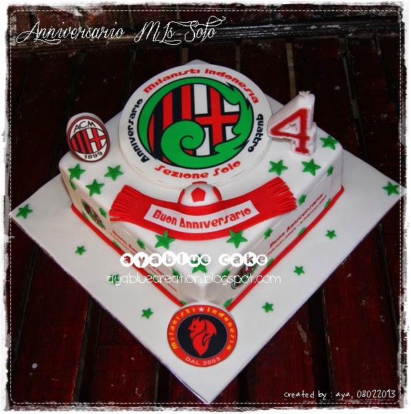 Aku kasih tambahan bola dan syal dg tulisan buon anniversario, untuk disamping cakenya ada logo plus tulisan juga.. ditambah bintang-bintang warna hijau untuk pemanis..